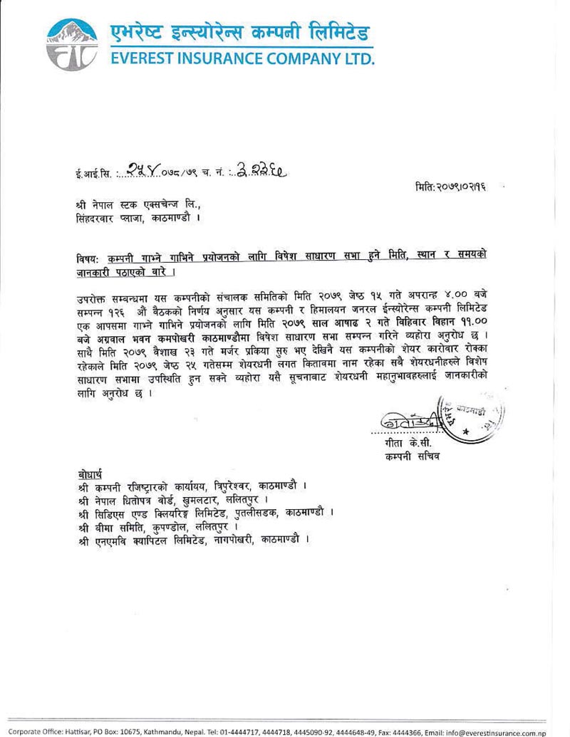कम्पनीले हिमालयन जनरल इन्स्योरेन्ससँग मर्जरमा जाने प्रस्ताव पारित गर्नका लागि विशेष साधारण सभा डाकेको हो । गत वैशाख २३ गते मर्जर प्रक्रिया सुरु भएदेखि नै एभेरष्ट इन्स्योरेन्स र हिमालयन जनरल इन्स्योरेन्सको शेयर कारोबार रोक्का रहेको छ ।