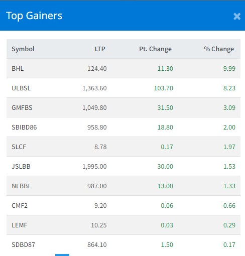 त्यस्तै, उपकार लघुवित्तको ८.२३ प्रतिशत, गणपति लघुवित्तको ३.९ प्रतिशत, नेपाल एसबिआई बैंकको १० प्रतिशत ऋणपत्रको २ प्रतिशत र सानिमा लार्ज क्याप फण्डको १.९७ प्रतिशतले शेयरमूल्य बढ्न पुगेको हो ।