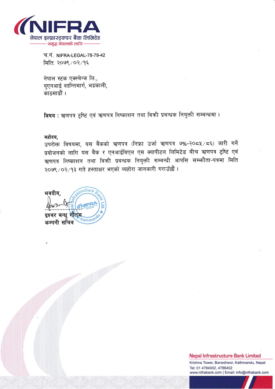 सो प्रयोजनका लागि निफ्राले एनआइबिएल एस क्यापिटल लिमिटेडलाई ऋणपत्र ट्रस्टि एवं निष्काशन तथा बिक्री प्रबन्धकमा नियुक्त गरेको छ ।