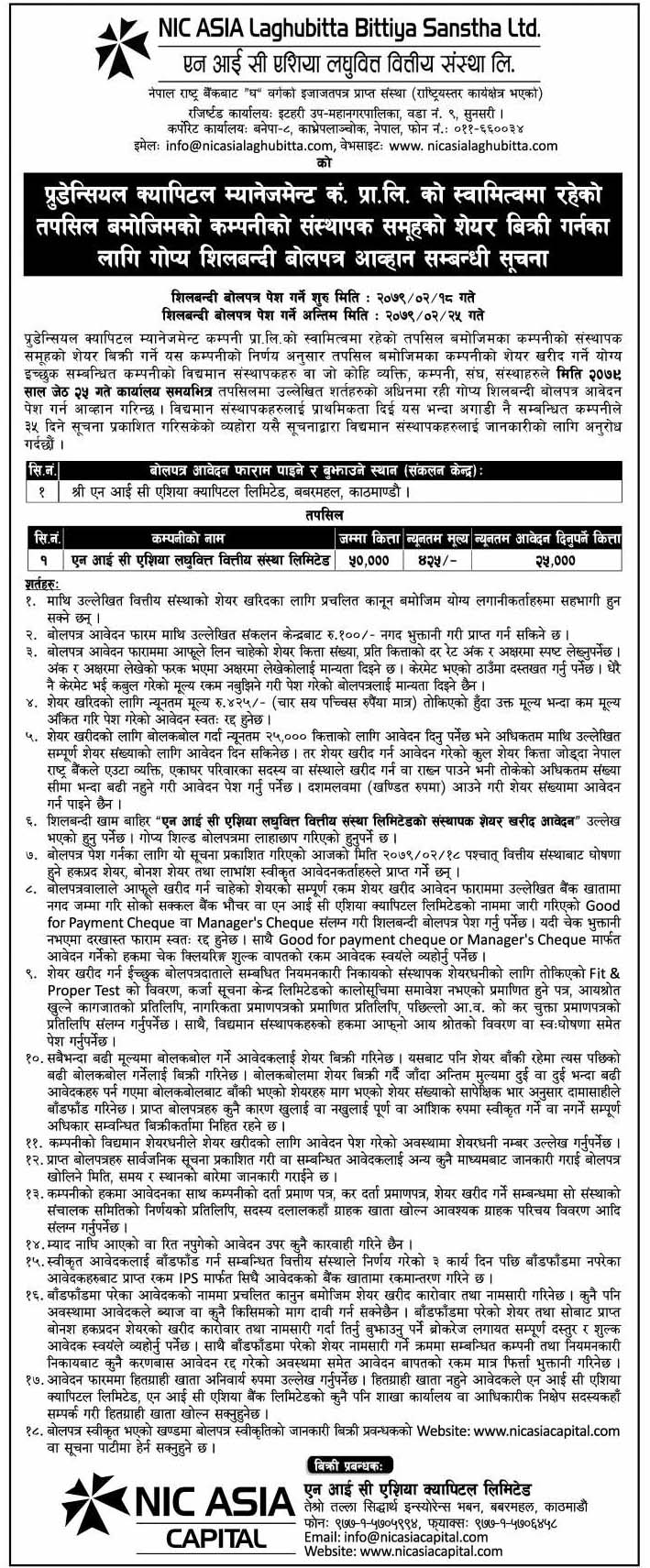 काठमाडौं । एनआईसी एशिया लघुवित्त वित्तीय संस्था लिमिटेडले संस्थापक समुहको शेयर आजदेखि बिक्रीमा ल्याएको छ । लघुवित्तले प्रुडेन्सियल क्यापिटल म्यानेजमेन्ट कम्पनी प्रा.लि.को स्वामित्वमा रहेको शेयर बिक्री गर्न लागेको हो ।
