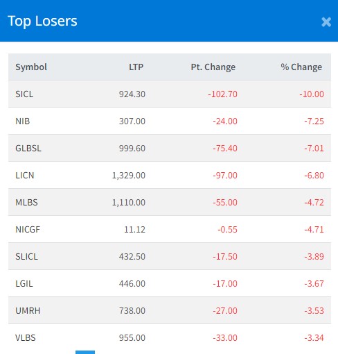 त्यस्तै, नेपाल इन्भेष्टमेन्ट बैंकको ७.२५ प्रतिशत, गुराँस लघुवित्तको ७.०१ प्रतिशत, लाइफ इन्स्योरेन्स कर्पोरेशनको ६.८० प्रतिशत र मानुषी लघुवित्तको ४.७२ प्रतिशतले शेयर घट्न पुगेको छ ।