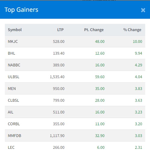 त्यस्तै, बलेफी हाइड्रोपावरको ९.९४ प्रतिशत, नारायणी डेभलपमेन्ट बैंकको ४.२९ प्रतिशत, उपकार लघुवित्तको ४.०४ प्रतिशत र माउन्टेन इनर्जीको ३.८३ प्रतिशतले शेयरमूल्य बढ्न पुगेको छ ।
