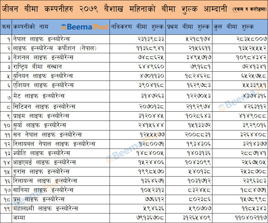 जीवन बीमा कम्पनीहरुको कुल बीमाशुल्क आर्जन १ खर्बमाथि, कुनको कति ? (तथ्यांक सहित)