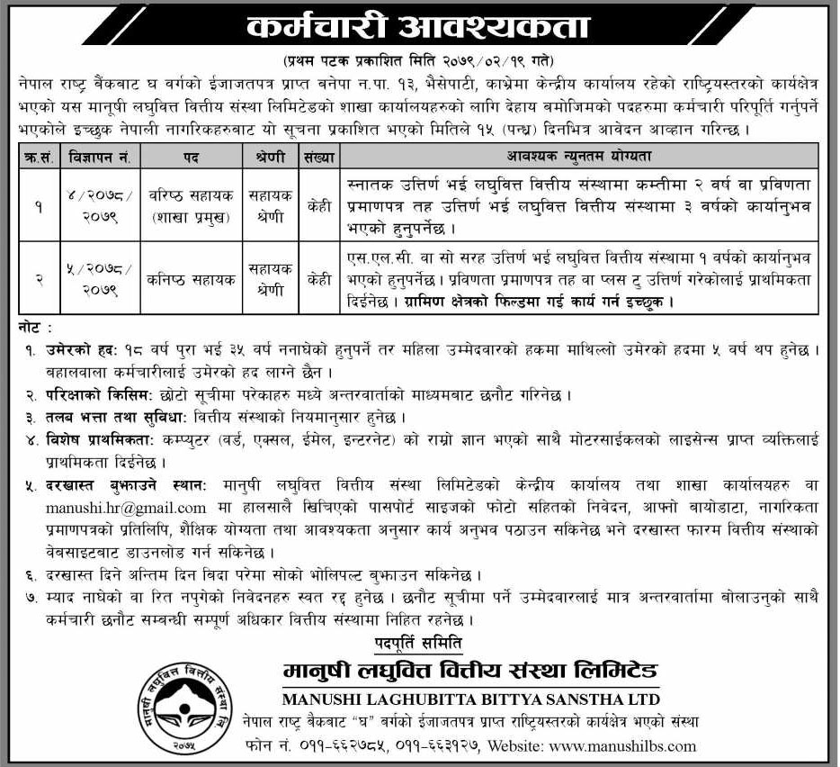 मानुषी लघुवित्त वित्तीय संस्था लिमिटेडले सहायक श्रेणीअन्तर्गत वरिष्ठ सहायक (शाखा प्रमुख) र कनिष्ठ सहायक केही संख्यामा माग गरेको छ ।