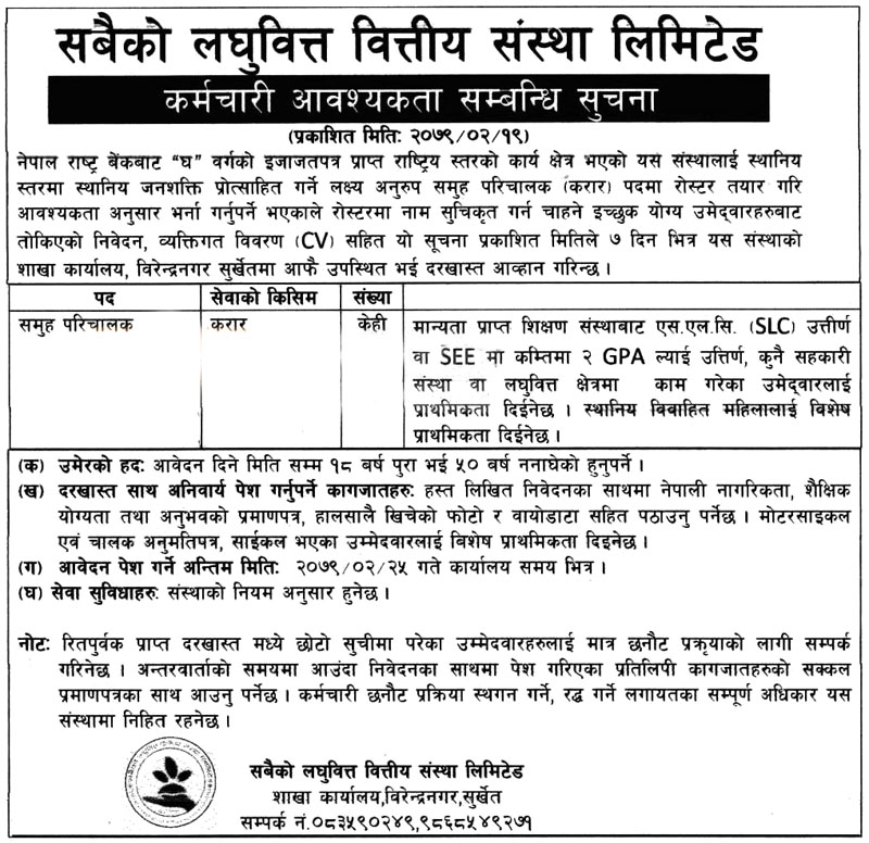 सबैको लघुवित्त वित्तीय संस्था लिमिटेडले करारमा समुह परिचालक केही संख्यामा माग गरेको छ । सो पदका लागि एसएलसी उत्तीर्ण गरेको शैक्षिक योग्यता हुनुपर्ने जनाएको छ ।