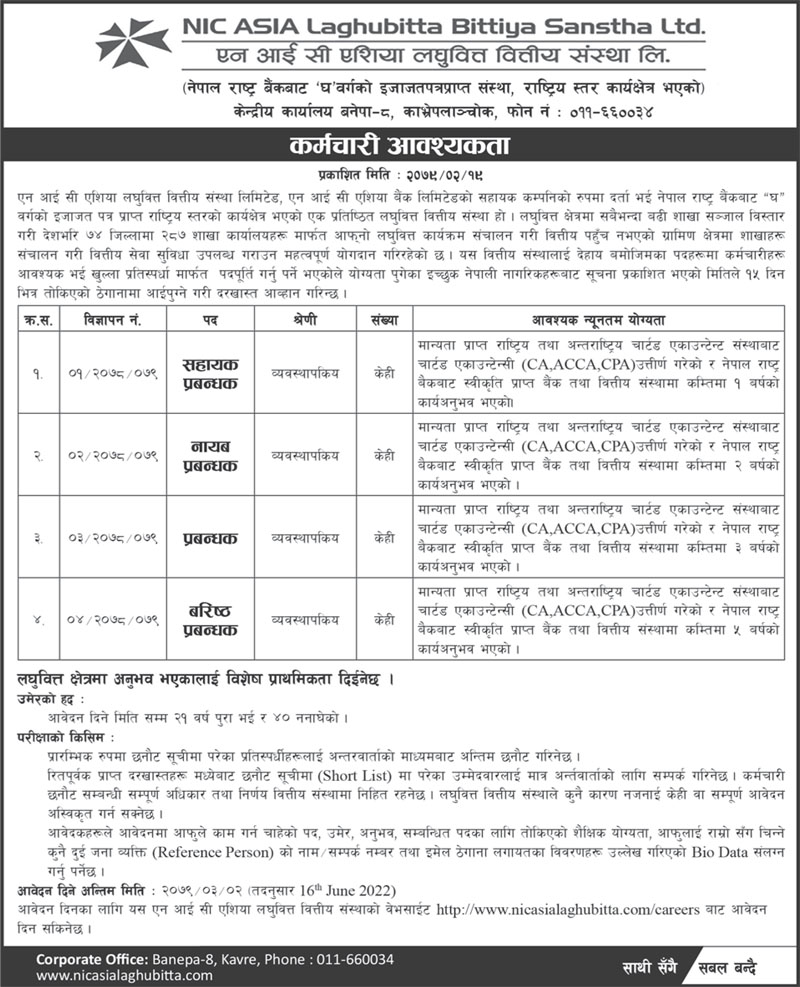 एनआइसी एशिया लघुवित्त वित्तीय संस्थाले व्यवस्थापकीय श्रेणीअन्तर्गत सहायक प्रबन्धक, नायब प्रबन्धक, प्रबन्धक र वरिष्ठ प्रबन्धकमा केही संख्यामा माग गरेको हो । उक्त पदहरुका लागि संस्थाले मान्यता प्राप्त चार्टर्ड एकाउन्टेन्ट संस्थाबाट चार्टर्ड एकाउन्टेन्सी उत्तीर्ण गरेको हुनुपर्ने जनाएको छ ।