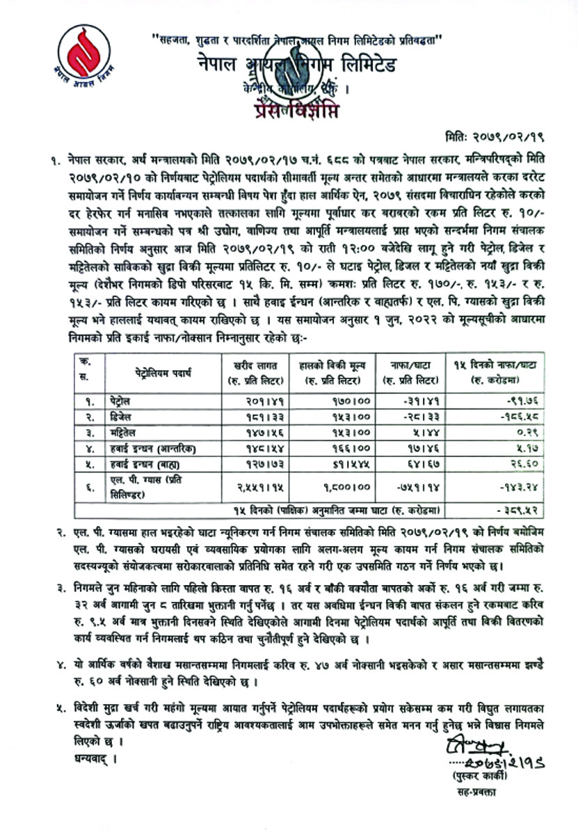 इन्डियन आयल कर्पोरेशनले नेपाल आयल निगमलाई जुन १ मा नयाँ मूल्य सूची पठाएको थियो । जसमा पेट्रोलको मूल्य प्रतिलिटर २२ रुपैयाँ २३ पैसा, डिजेल र मट्टितेलको मूल्य १९ रुपैयाँ ७३ पैसा र एलपी ग्याँस ७५१ रुपैयाँ १४ पैसा घाटामा रहेको थियो ।