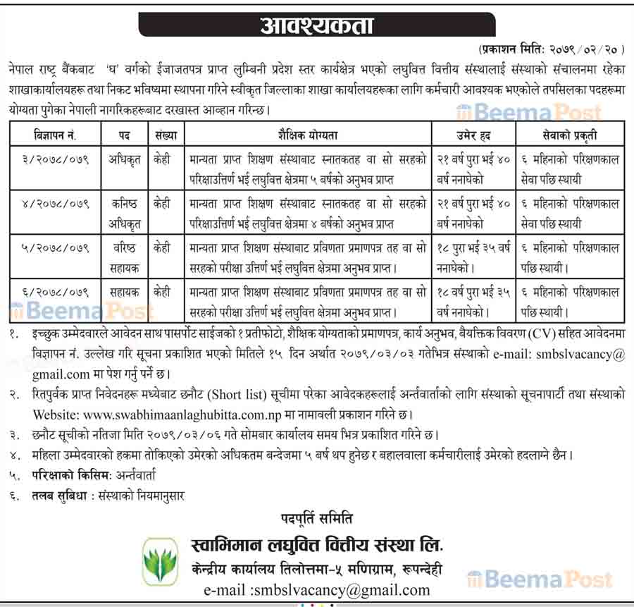 काठमाडौं । स्वाभिमान लघुवित्त वित्तीय संस्था लिमिटेडले रो्जगारीको अवसर खुलाएको छ । कम्पनीले जेठ २० गते एक सूचना प्रकाशित गर्दै विभिन्न पदमा कर्मचारी आवश्यक रहेको बताएको हो ।