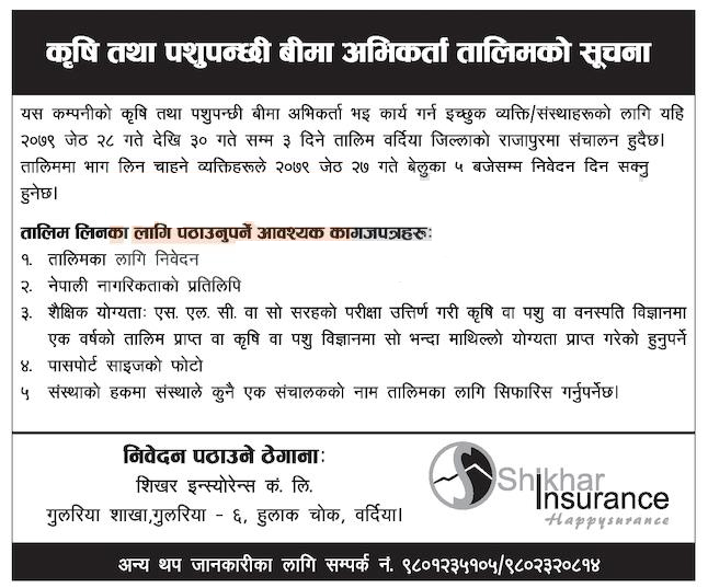 कम्पनीको कृषि तथा पशुपन्छी बीमा अभिकर्ताा भई कार्य गर्न इच्छुक व्यक्ति।संस्थाहरुको लागि शिखर इन्स्योरेन्सले जेठ २८ गतेदेखि ३० गतेसम्म ३ दिन तालिम संचालन गर्न लागेको हो ।