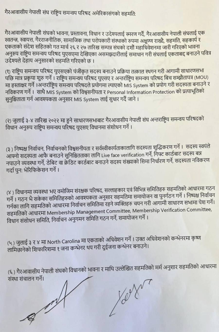 काठमाडौं । केही समयदेखि एनआरएनए अमेरिकामा देखिएको दोहोरो संस्थाको विवाद समाप्त भएको छ । अध्यक्ष बुद्धी सुवेदी र कृष्ण लामिछानेबीच आइतवार ६ बुँदे सहमतिमा हस्ताक्षर भएको हो ।