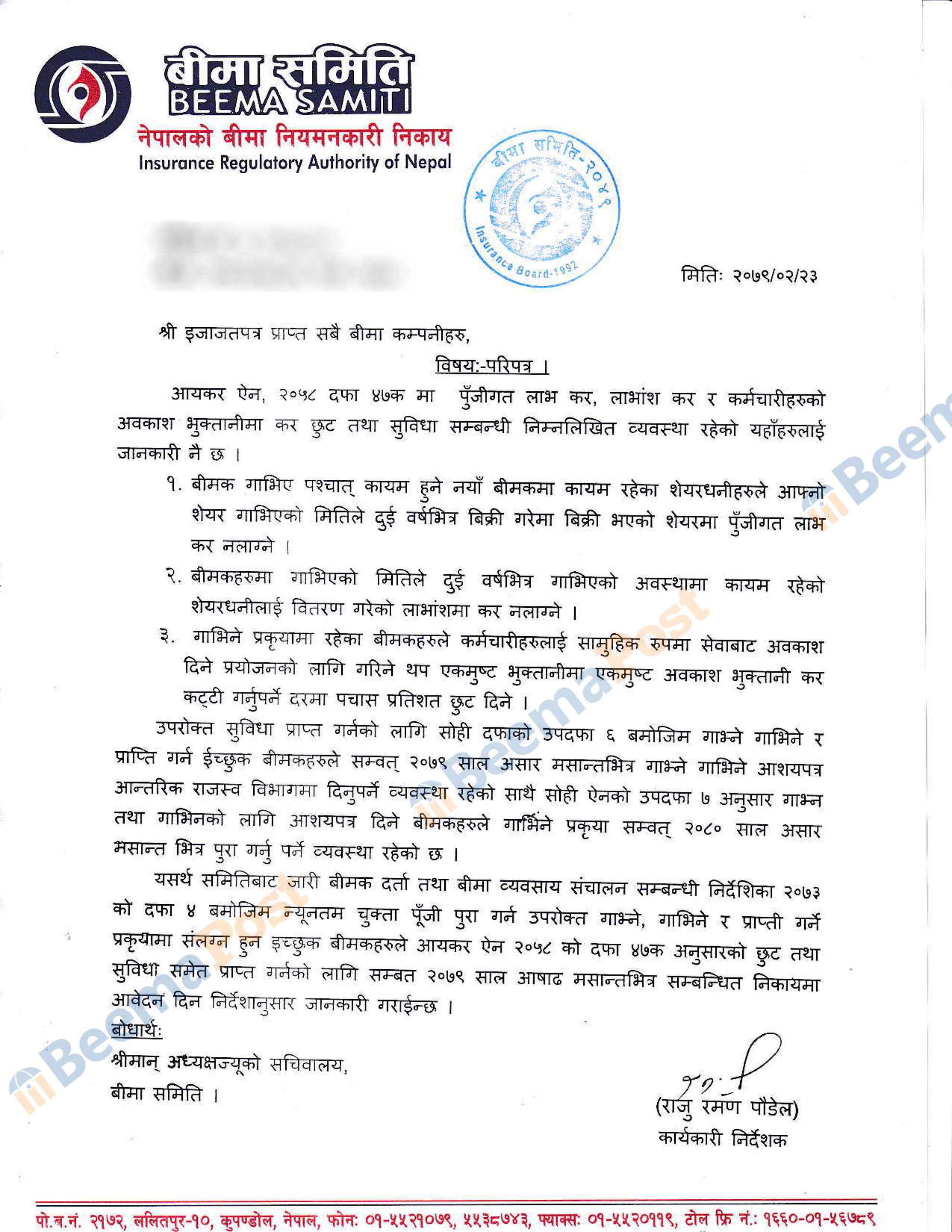 बीमा समितिका कार्यकारी निर्देशक राजुरमण पौडेलले हिजो सबै बीमा कम्पनीहरुलाई पठाएको निर्देशनमा गत आवमा सरकारले दिएको छुट सुविधाबारे तीन वटा बुँदामा प्रष्ट पार्दै उक्त सुविधा लिन असारभित्रैमा मर्जरका लागि एमओयुमा हस्ताक्षर गर्नुपर्ने व्यवस्था रहेको कुरा स्मरण गराइएको छ ।