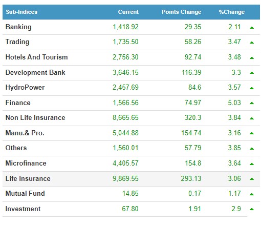 नेप्सेमा रहेका १३ उपसूचक नै आज चम्किएको छ । सबै समूहमा हरियाली छाउँदा सर्वाधिक निर्जिबन बीमा समूहको ३२० रुपैयाँले बढ्न पुगेको छ । त्यस्तै, जीवन बीमा समूहको २९३.१३ रुपैयाँ र विकास बैंक समूहको ११६.३९ रुपैयाँले बढेको छ ।