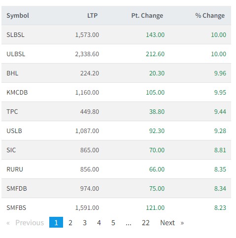 त्यस्तै, बलेफी हाईड्रोपावर, कालिका लघुवित्त, तेह्रथुम पावर, उन्नती सहकार्य, सगरमाथा इन्स्योरेन्स, रुरु जलविधुत्, समिट लघुवित्त, स्वाभिमान लघुवित्तका लगान्ीकर्ताले सर्वाधिक कमाएका छन् ।