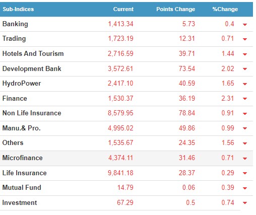 अघिल्लो दिन हरियाली छाएको १३ उपसूचक नै आज राताम्य भएका छन् । नेप्से घटेसँगै आज सर्वाधिक विकास बैंक समुहको ७३.५४ रुपैयाँले घट्न पुगेको छ । त्यस्तै, हाइड्रोपावर सूचकको ४०.५९ रुपैयाँले घटेको छ भने उत्पादन तथा प्रशोधन समूहको ४९.८६ रुपैयाँले घट्न पुगेको छ ।