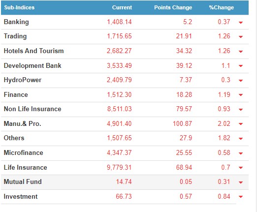 त्यस्तै, नेप्सेमा रहेका १३ उपसूचक नै आज राताम्य भएका छन् । सर्वाधिक उत्पादन तथा प्रशोधन समूहको खस्किएको छ । सो समूहको आज १००.८७ रुपैयाँले घट्न पुगेको छ । त्यस्तै, जीवन बीमा समूहको ६८.९४ रुपैयाँ, निर्जिबन बीमा समूहको ७९.५७ रुपैयाँले घट्न पुगेको छ ।