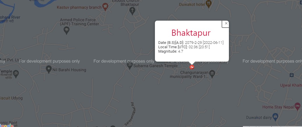 भक्तपुरको चाँगुनारायण मन्दिरको पश्चिमतर्फको खेतमा केन्द्रबिन्दु भएर भुकम्प गएको हो । भुकम्पबाट कुनै क्षति भएको खवर आएको छैन ।