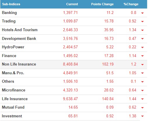 नेप्सेमा रहेका १३ उपसूचक नै आज राताम्य भएका छन् । सर्वाधिक आज बीमा कम्पनीहरुको शेयरमूल्य घट्न पुगेको छ । जीवन बीमा सूचकको आज १४० रुपैयाँ ८४ पैसाले घटेको छ भने निर्जिबन बीमा सूचकको १०२ रुपैयाँ १९ पैसाले घट्न पुगेको छ । त्यस्तै, होटल तथा पर्यटन समूहेको ३५.९५ रुपैयाँ, बैकिङ्गको ११.२ रुपैयाँ, हाइड्रोपावरको ५.२२ रुपैयाँले घट्न पुगेको छ ।
