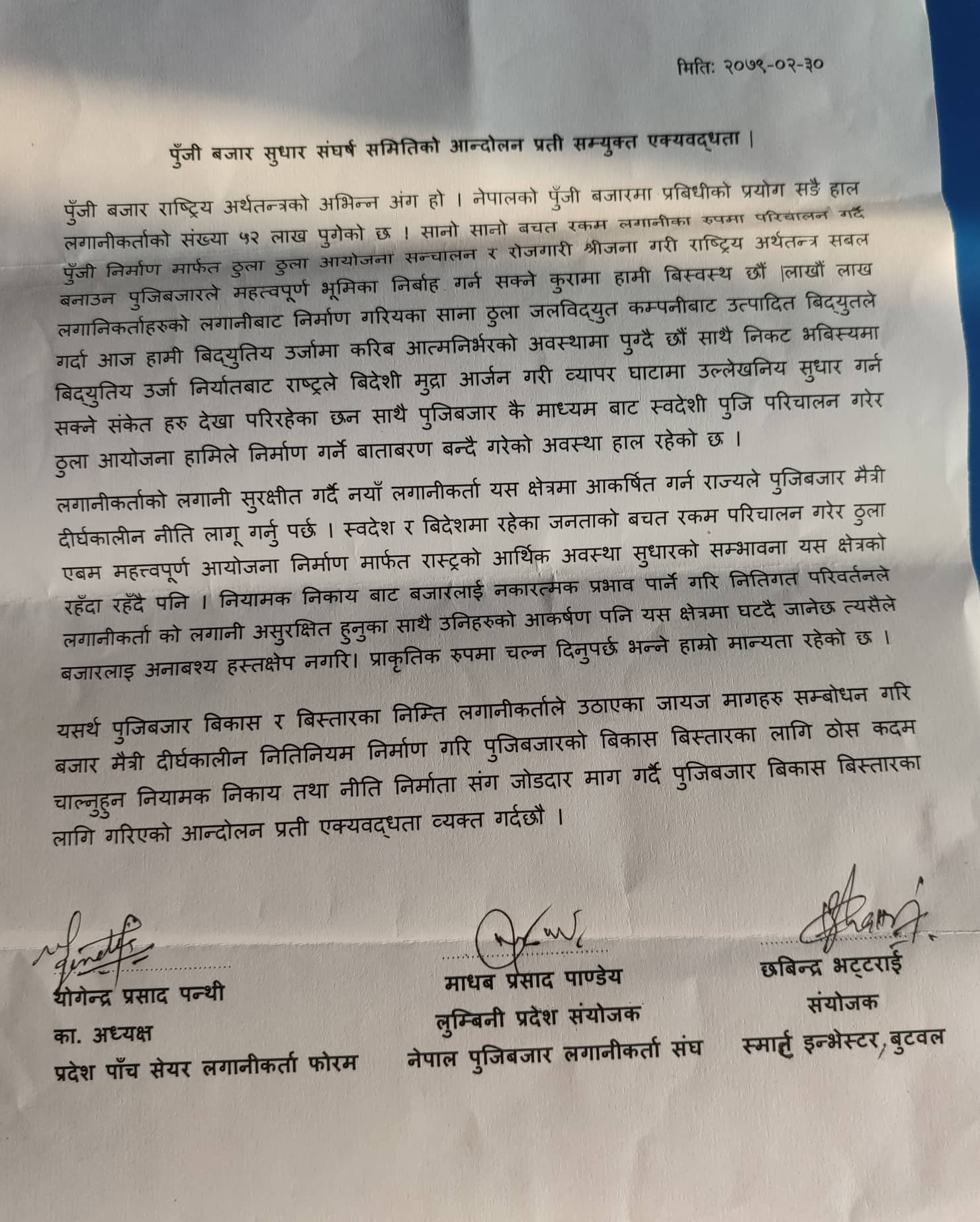 पूँजी बजार सुधार संघर्ष समितिको आन्दोलनप्रती एक्यवद्धता