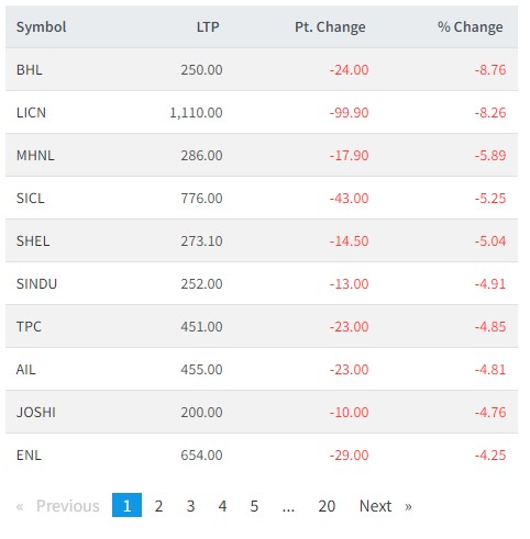त्यस्तै, एलआईसी (नेपाल), माउन्टोन हाईड्रो, शिखर इन्स्योरेन्स, सिंगटी हाईड्रोपावर, सिन्धु विकास बैंक, तेह्रथुम पावर, अजोड इन्स्योरेन्स, जोशी हाईड्रोपावर, इमजीङ पावरको शेयर सबैभन्दा धेरै घटेको छ।
