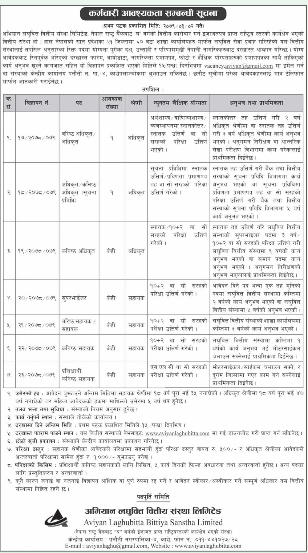लघुवित्तले वरिष्ठ अधिकृत।अधिकृत, अधिकृत।कनिष्ठ अधिकृत (सूचना प्रविधि)मा एक–एक जना कर्मचारी माग गरेको हो । त्यस्तै, कनिष्ठ अधिकृत, सुपरभाईजर, वरिष्ठ सहायक।सहाकय, कनिष्ठ सहायक र प्रशिक्षार्थी कनिष्ठ सहायकमा केही संख्यामा कर्मचारी माग गरेको हो ।
