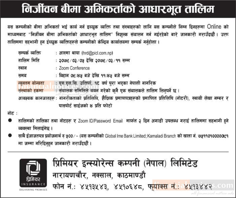 काठमाडौ । प्रिमियिर इन्स्योरेन्स कम्पनी (नेपाल) लिमिटेडले निर्जिबन बीमा अभिकर्ताको आधारभूत तालिम संचालन गर्ने भएको छ । कम्पनीले एक सूचना प्रकाशित गर्दै एक साता तालिम दिने जनाएको हो ।