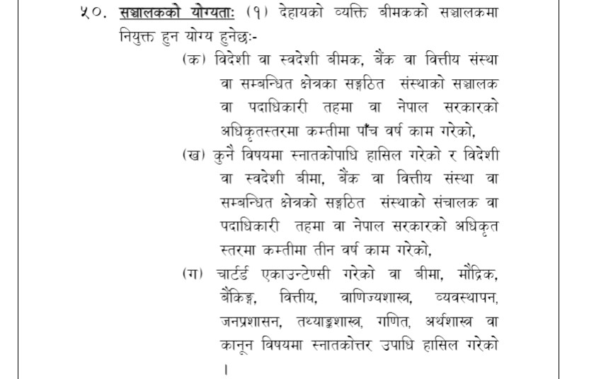 बीमा कम्पनीको संचालक बन्न स्नातकोपाधि* अनिवार्य गरिएको छ । तर, यसअघि सञ्चालक बनिसकेको व्यक्तिको लागि शैक्षिक योग्यताको कारण रोकिने छैन । चार्टर्ड एकाउन्टेन्सी (सीए) पास गरेकाले संचालक बन्न पाउने प्रष्ट पारिएको छ ।बीमा कम्पनीको सञ्चालक बन्न सीए, वा बीमा, बैंकिङ, वित्तीय, वाणिज्यशास्त्र, तथ्याङ्कशास्त्र, व्यवस्थापन, जनप्रशासन, तथ्याङ्कशास्त्र, गणित, अर्थशास्त्र वा कानुन विषयमा स्नातक गरेको हुनुपर्ने नयाँ ऐनमा रहेको छ ।