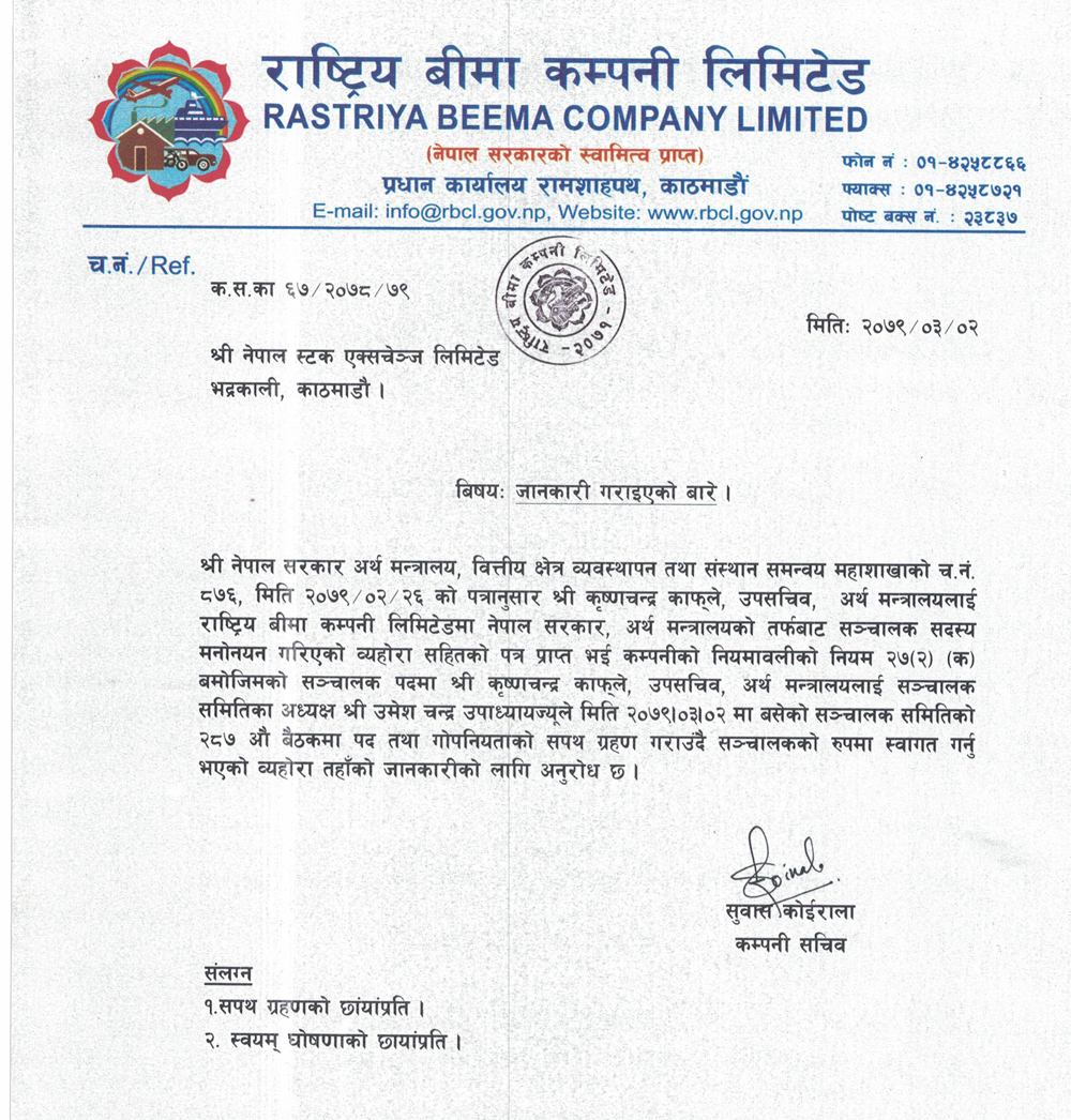 काठमाडौं । राष्ट्रिय बीमा कम्पनीको संचालक सदस्यमा कृष्णचन्द्र काफ्ले नियुक्त भएका छन् । कम्पनीले आज नेप्सेमार्फत जानकारी गराएको सूचनामा काफ्लेलाई कम्पनीको संचालक सदस्यमा चयन गरेको हो ।