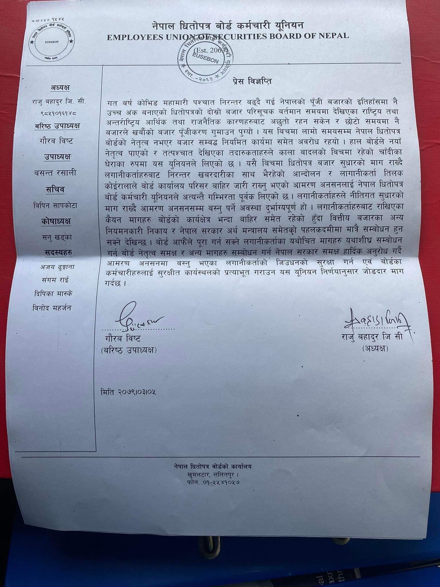 धितोपत्र कर्मचारी यूनियनले एक विज्ञप्ति जारी गर्दै अनसनमा बसेका लगानीकर्ताको जिउधनको सुरक्षा गर्न र बोर्डका कर्मचारीहरुलार्य सुरक्षित कार्यस्थलको प्रत्याभूत गराउन सरकारसमक्ष अनुरोध गरेको हो ।