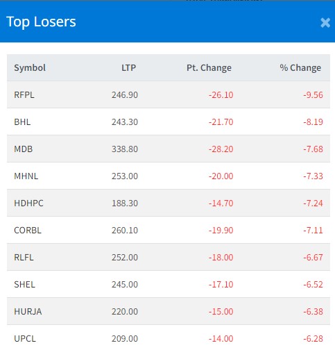 त्यस्तै, बलेफी हाइड्रोपावरको ८.१९ प्रतिशत, मितेरी डेभलपमेन्ट बैंकको ७.६८ प्रतिशत, माउन्टेन हाइड्रो नेपालको ७.३३ प्रतिशत र हिमालय दोलखा हाइड्रोपावरको ७.२४ प्रतिशतले शेयरमूल्य घट्न पुगेको छ ।
