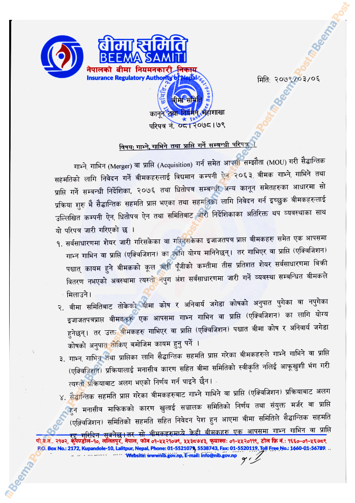 बीमा समितिको कानुन तथा नियमक महाशाखाले सम्पुर्ण बीमा कम्पनीहरुलाई परिपत्र जारी गर्दै अब मर्जर भएका बीमा कम्पनीहरुको न्युनतम ३० प्रतिशत शेयर सर्वसाधारणको हुनुपर्ने व्यवस्था गरेको छ । गाभ्ने, गाभिने वा प्राप्तीका लागि सैदान्तिक सहमति लिगेका वा सैदान्तिक सहमति लिग्न इच्छुक कम्पनीहरुले कुल जारी पुँजीको कम्तीमा ३० प्रतिशत सर्वसाधारणको हुनेगरि निर्देशन जारी गरेको हो ।