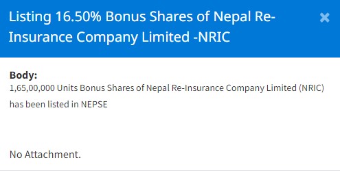 सो प्रतिशत दरका १ करोड ६५ लाख कित्ता बोनस शेयर सूचीकृत भएको हो । सूचीकृतपश्चात् उक्त शेयर सम्बन्धित शेयरधनीको हितग्राही खातामा जम्मा भएपछि शेयरधनीले धितोपत्र दोस्रो बजारमा खरिदबिक्री गर्न पाउनेछन् ।