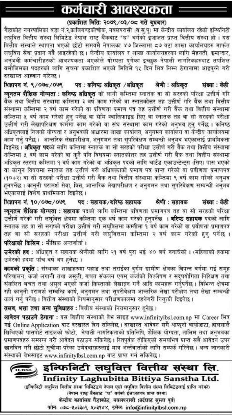 योग्यता पुगेका इच्छुक व्यक्तिले १५ दिनभित्र कम्पनीको वेबसाइट https://infinitylbsl.com.np/ मार्फत् आवेदन दिन सक्नेछन् ।
