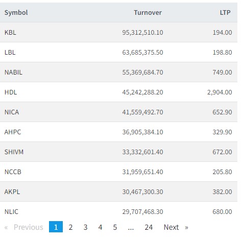 त्यस्तै, लक्ष्मी बैंक, नबिल बैंक, हिमालयन डिष्टिलरी, एनआईसी एशिया बैंक, अरुण भ्याली, शिव्म सिमेन्ट्स, एनसीसी बैंक, अरुण काबेली पावर र नेपाल लाइफको सर्वाधिक कारोबार भएको छ।