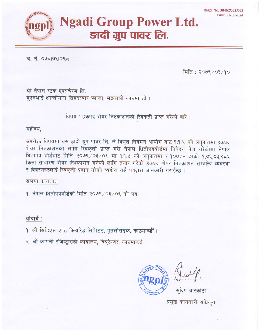 ङादी ग्रुप पावरले १ करोड कित्ता हकप्रद जारी गर्ने, बोर्डबाट पायो अनुमति