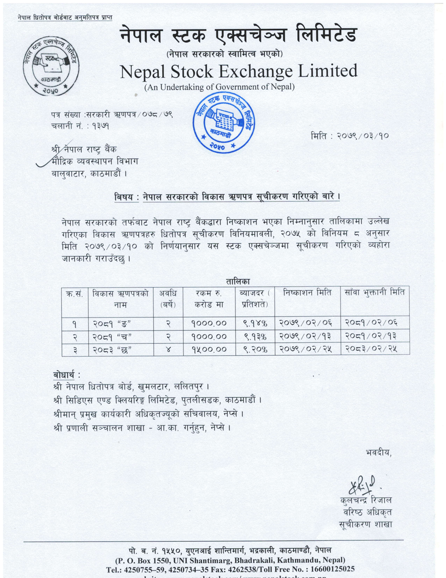 नेपाल राष्ट्र बैंकले २ वर्षे अवधि तथा ९.१४ प्रतिशत ब्याजदर रहेको १० अर्ब रुपैयाँकोे ‘२०८१ ङ’ नामक विकास ऋणपत्र, २ वर्षे अवधि रहेको ९.१३ प्रतिशत ब्याजदर रहेको १० अर्ब रुपैयाँकै ‘२०८१ च’ नामक विकास ऋणपत्र र ४ वर्षे अवधि रहेको ९.२० प्रतिशत ब्याजदर रहेको १५ अर्ब रुपैयाँको ‘२०८३ छ’ नामक ऋणपत्र सूचीकृत गराएको हो ।