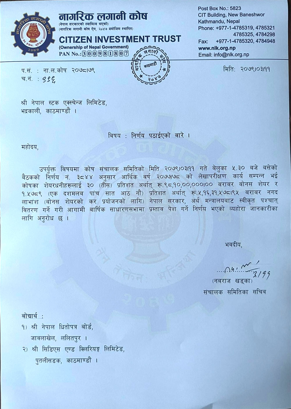नागरिक लगानी कोषको लाभांश घोषणा, बोनस र नगद कति ?