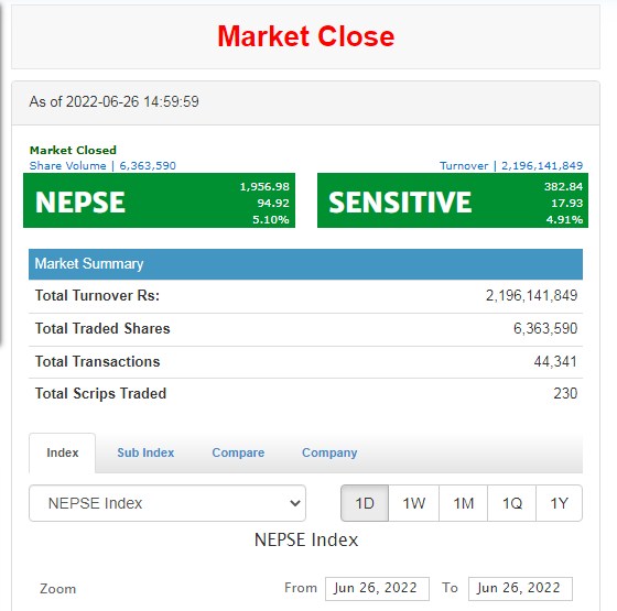 आइतबार शेयर बजारमा समग्र मूल्य परिसूचक ९४.९२ अंकले बृद्धि भई १९५६.९८ को बिन्दुमा पुगेको छ । आइतबार दुई अर्ब १९ करोड ६१ लाख रुपैयाँको शेयर कारोबार भएको छ । लामो समयपछि नेप्सेमा दुई अर्बमाथि कारोबार भएको हो ।
