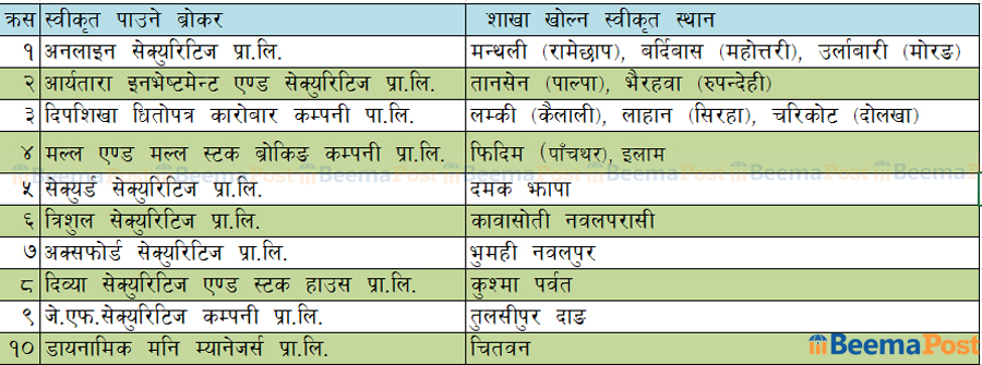 भिजन सेक्युरिटिजले कावासोती नवलपरासी, बेनी म्यादी, दमौली तनहुँमा गरि तीनवटा शाखा संचालनको लागि स्वीकृति पाएको छ भने अनलाइन सेक्युरिटिजले बट्टार नुवाकोट, दिपशिखा धितोपत्रले टांडी चितवन, नेपाल स्टक हाउसले बिदुर नुवाकोट तथा टिकापुर कैलालीमा शाखा संचालनको लागि स्वीकृति पाएका हुन्।