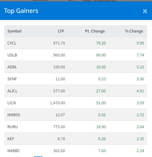 त्यस्तै, उन्नती सहकार्य लघुवित्तको ७.७४ प्रतिशत, कृषि विकास बैंकको ५.१० प्रतिशत, सनराइज फर्स्ट म्युचुअल फण्डको ५.०६ प्रतिशत र एशियन लाइफ इन्स्योरेन्सको ४.९१ प्रतिशतले शेयरमूल्य बढ्न पुगेको छ ।