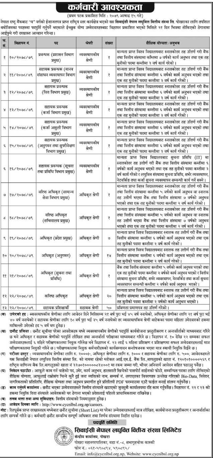 योग्यता पुगेका इच्छुक ब्यक्तिले २१ दिनभित्र कम्पनीको वेबसाइट https://cycnlbsl.org.np/careers/ मार्फत दरखास्त दिन सक्नेछन् ।