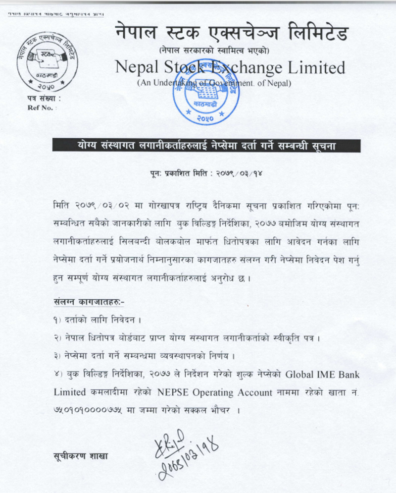 नेप्सेले सूचना प्रकाशित गर्दै बुक बिल्डिङ्गमार्फत आइपीओको निष्काशन गर्न सम्बन्तिधत संस्थागत लगानीकर्ताहरुलाई बुक बिल्डिङ्ग निर्देशिका, २०७७ बमोजिम सिलबन्दी बोलकबोलमार्फत धितोपत्रका लागि आवेदन गर्न नेप्सेमा दर्ता गर्न आग्रह गरेको हो ।