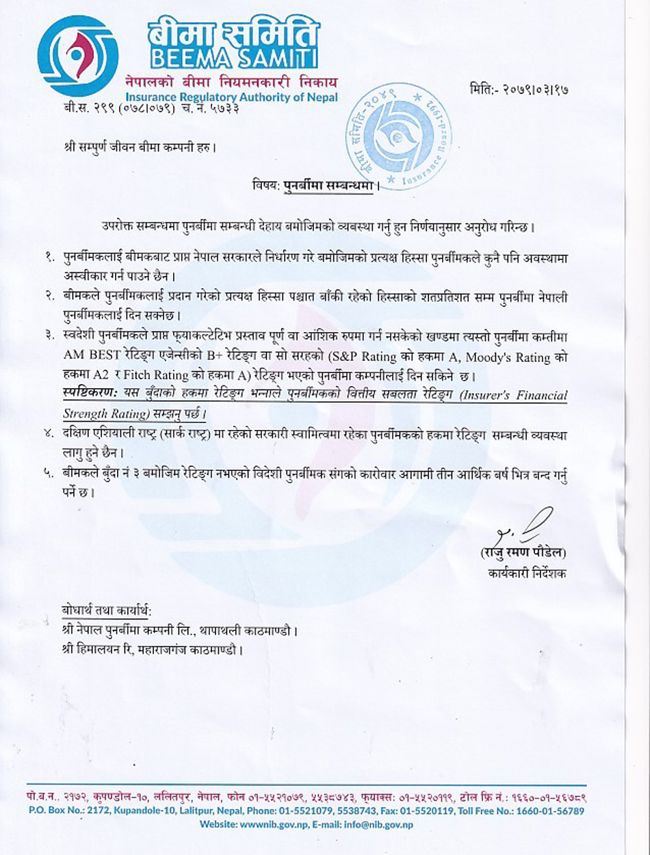 बीमा समितिद्धारा पुनर्बीमा सम्बन्धी नयाँ निर्देशन जारी, शतप्रतिशत पुनर्बीमा नेपालमै गर्न पाइने