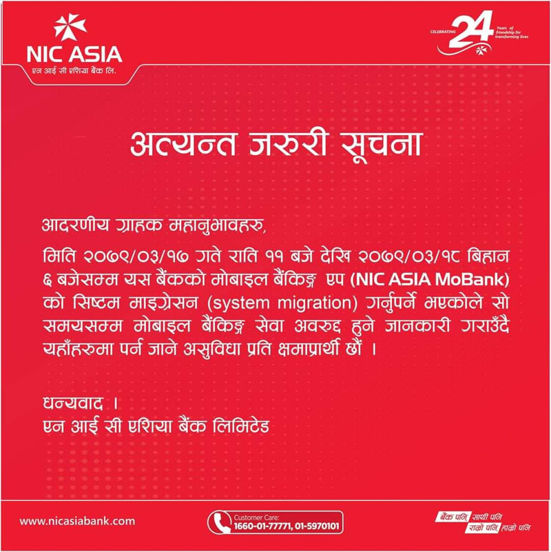 उक्त मोबाइल बैकिङ्गको सिष्टम माइग्रेसन गर्नुपर्ने भएकोले सो समयसम्म सेवा अवरुद्ध हुने बैंकले जानकारी गराएको छ ।
