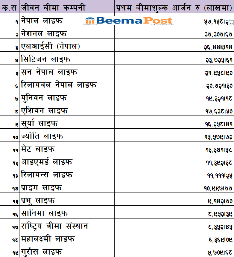 त्यस्तै, आइएमई लाइफले १ अर्ब १३ करोड रुपैयाँ, रिलायन्स लाइफले १ अर्ब ११ करोड रुपैयाँ, प्राईम लाइफले १ अर्ब ९ करोड रुपैयाँ, प्रभु लाइफले ९१ करोड रुपैयाँ, सानिमा लाइफले ८९ करोड रुपैयाँ, राष्ट्रिय बीमा संस्थानले ८३ करोड रुपैयाँ, महालक्ष्मी लाइफले ६३ करोड रुपैयाँ र गुराँस लाइफले ५७ करोड रुपैयाँ प्रथम बीमशुल्क आर्जन गर्न सफल भएका छन् ।