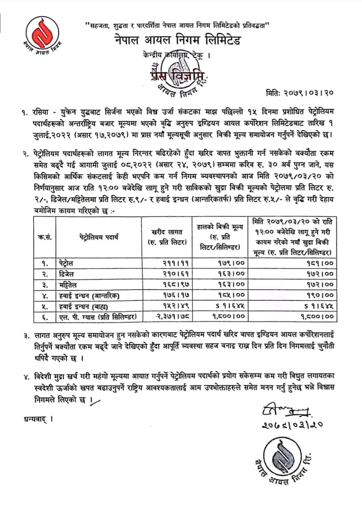 सोमबार राति १२ बजेबाट लागू हुने गरी निगमले पेट्रोल लिटरमा २ रूपैयाँ र डिजेल तथा मट्टीतेल लिटरमा ९ रूपैयाँ र हवाइ इन्धन आन्तरिकमा पाँच रूपैयाँ बढाएको हो।