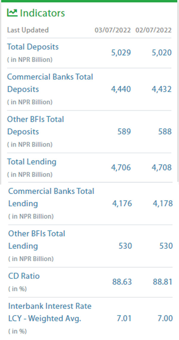 केन्द्रीय बैंकका अनुसार असार १९ गतेसम्म बैंक तथा वित्तीय संस्थाहरुको निक्षेप ५० खर्ब २९ अर्ब रुपैयाँ पुगेको छ । अघिल्लो दिन अर्थात् असार १८ गतेसम्म बैंक तथा वित्तीय संस्थाहरुको निक्षेप ५० खर्ब २० अर्ब रुपैयाँ रहेको थियो । एकैदिन ९ अर्ब निक्षेप थपिन पुगेको हो ।