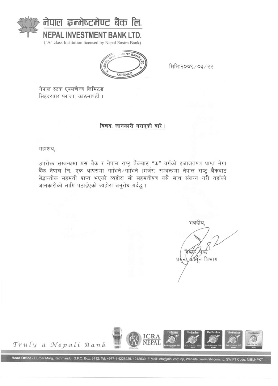 काठमाडौं । नेपाल इन्भेष्टमेन्ट बैंक र मेगा बैंक नेपाल लिमिटेडबीचको मर्जरलाई नेपाल राष्ट्र बैंकले अन्तिम स्वीकृति प्रदान गरेको छ । यी दुवै बैंकबीच गत जेठ २७ गते मर्जरमा जाने सम्झौतापत्रमा हस्ताक्षर भएको हो ।