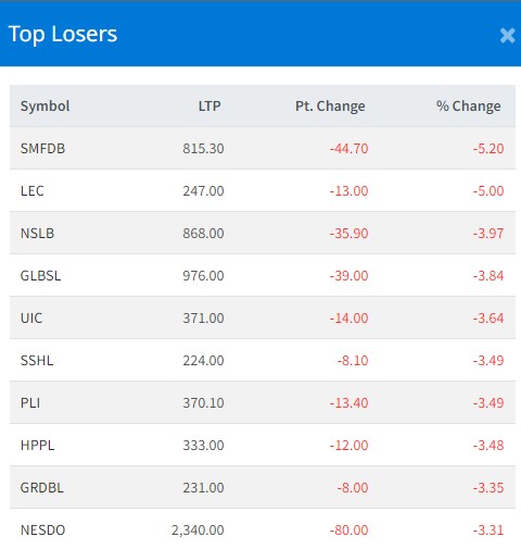 त्यस्तै, लिबर्टी इनर्जीको ५ प्रतिशत, नयाँ सारथी लघुवित्तको ३.९७ प्रतिशत, गुराँस लघुवित्तको ३.८४ प्रतिशत र युनाइटेड इन्स्योरेनसको ३.६४ प्रतिशतले घटेको छ ।