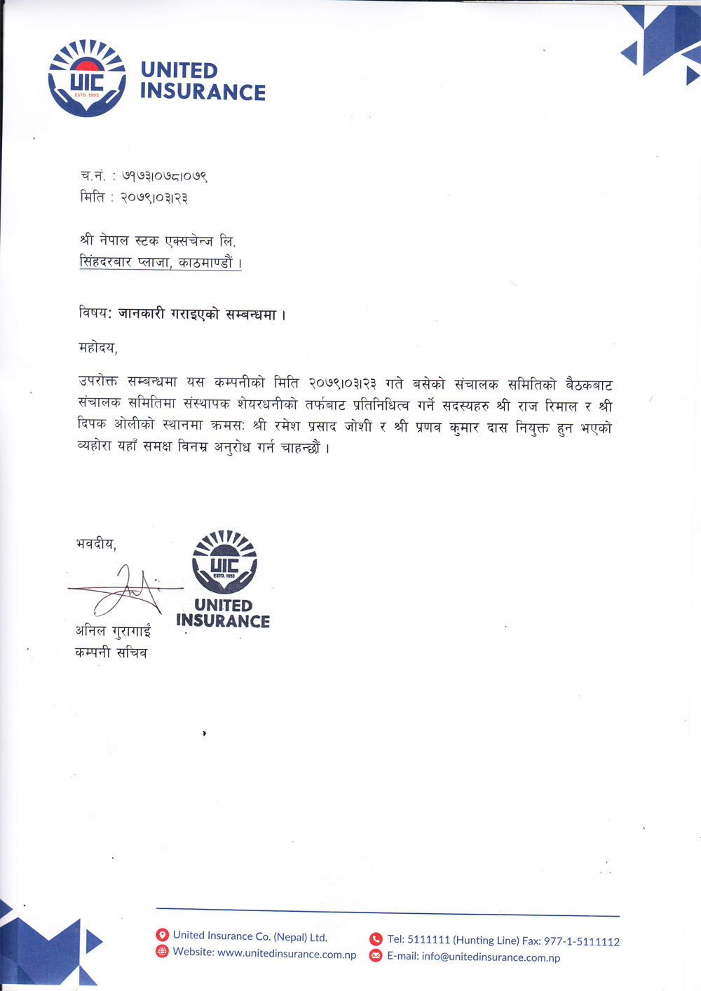 युनाइटेड इन्स्योरेन्सको संचालक परितर्वन