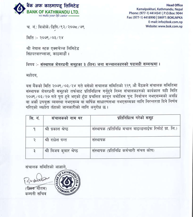 काठमाडौं । बैंक अफ काठमाण्डूका अध्यक्ष प्रकाश श्रेष्ठसहित ३ जना संचालकहरुको पदावधि थप गरिएको छ ।